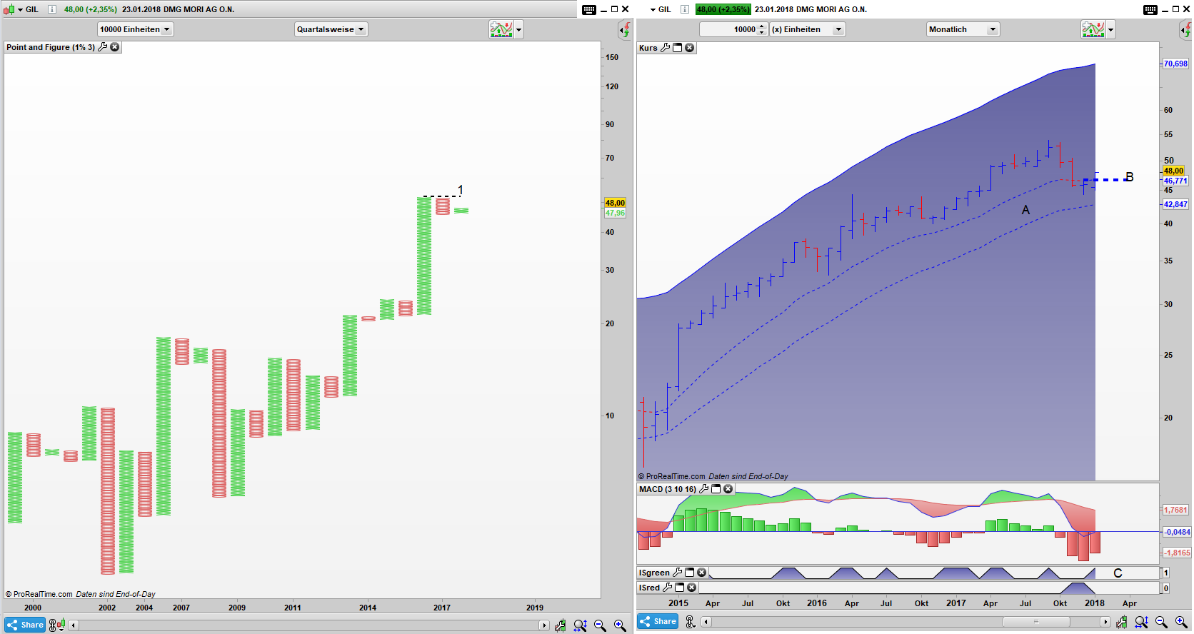 Insgesamt sind die Bullen im Moment im Vorteil, auch dass der Trend schon viele Jahre anhält, ist ein Argument dafür, dass der Trend fortgesetzt wird. Sollte die DMG Mori Aktie unter das Dezember Tief fallen, ist das positive Szenario beendet und die Bären bekommen ihre Chance.