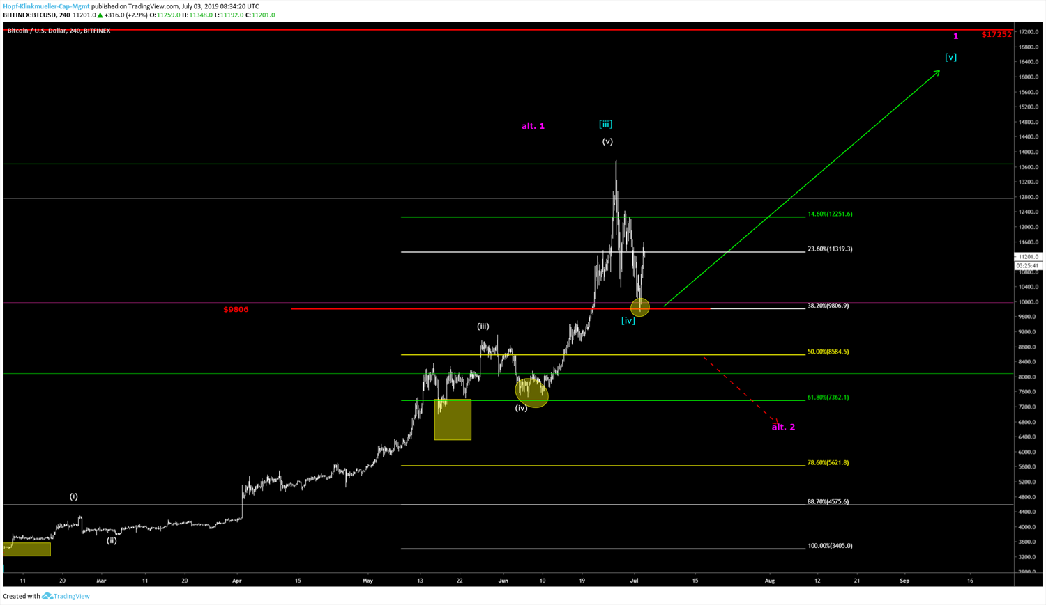 Wer auf einer Plattform handelt, die keine Stopps anbietet, kann sich hier mit einem Preisalarm behelfen und dann manuell die Position schließen. Im Bitcoin bleibt ansonsten die Primärerwartung, dass wir in Welle [v] in Türkis neue Hochs erreichen. Für diese Einschätzung muss aber das jetzige Tief bei $9806 unbedingt verteidigt werden.
