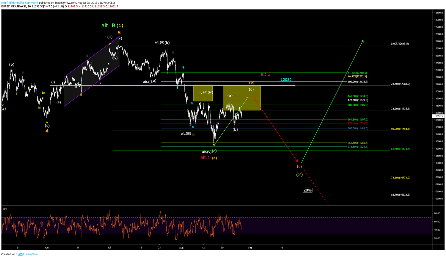 Im Bereich von 11950 Punkten werden wir einen Short hinterlegen, um den Markt in Richtung 11000 Punkte zu begleiten. Der DAX befindet sich im aktuellen Szenario somit nach wie vor in einer korrektiven Aufwärtsbewegung, nach deren Abschluss tiefere Notierungen anstehen.