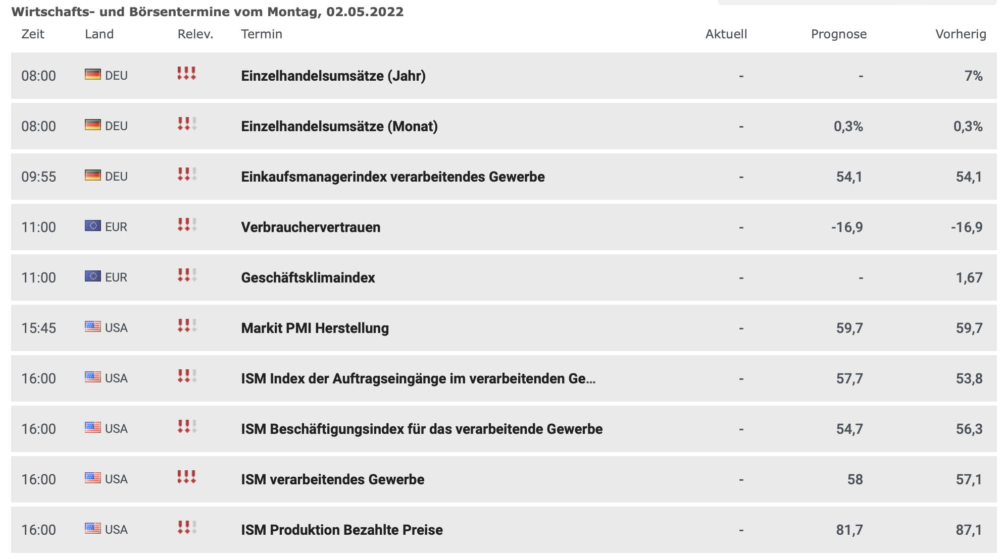 Am Nachmittag folgt der US Markit PMI der Herstellung 15.45 Uhr und 16.00 Uhr ein ganzer Schwung vom ISM, bezogen auf das verarbeitende Gewerbe und die Produktion.