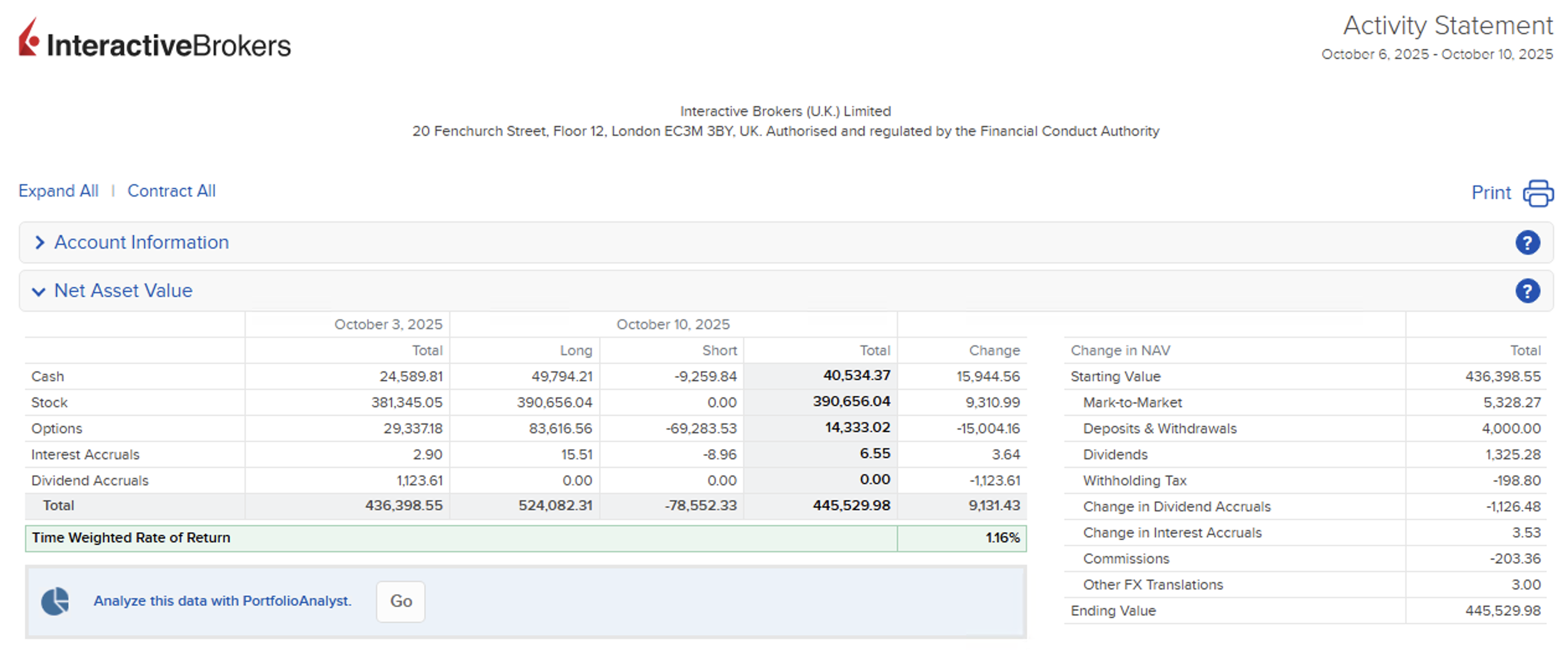 Mit 5.131,43 EUR Wochengewinn, umgerechnet 1.16%, kann ich mich wahrlich nicht beschweren. Insbesondere bei dem Wochenverlauf in den Indizes. Das Depot steigt auf 445.529,98 EUR. Die Cushion ist gut mit 83.69%. Offene Prämien sind bei ca. 12kUSD.