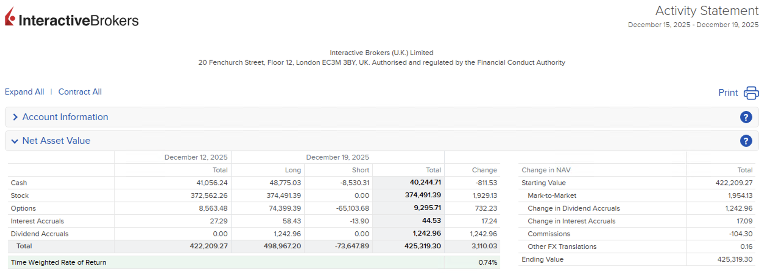 Depot gewinnt 3.110,03 EUR, umgerechnet 0.74%. Der Depotwert steigt auf 425.319,30 EUR. Die Cushion ist ok mit 77.21%. Offene Prämien sind ca. 15kUSD.