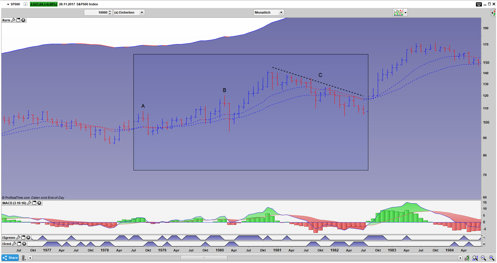 In der Zeit zwischen August 1978 und Juli 1982 kam es zu zwei abrupten Korrekturen, die einmal -15% und -21% verursachten. Die dritte Phase C war hingegen ein lang gestreckter Bärenmarkt der im August 1982 endete. Währenddessen der Markt 28% an Wert verloren hatte.