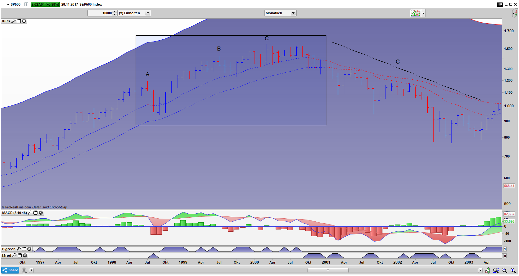 Diese dritte Phase ist geprägt durch solch heftige Ereignisse wie dem LTCM Crash (A) der binnen von 2 Monaten zu einem Abfall des Indizes um 21% führte. Danach kam es zu der kleinen Korrektur B, die aber recht gediegen verlief. Doch im folgenden Jahr erreichte der Markt sein Hoch bei 1552 Punkten und die Dotcom Blase platzte.