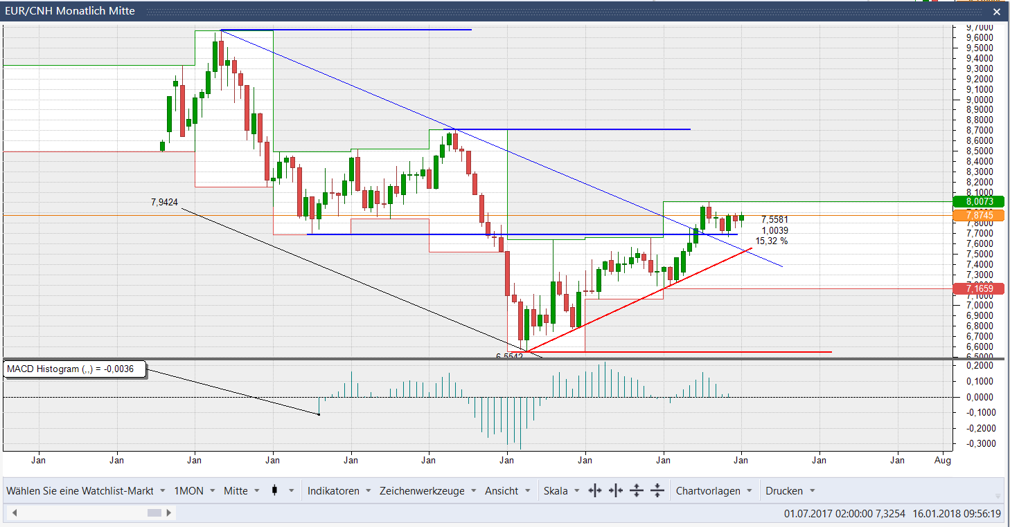 Der über viele Jahre gültige Abwärtstrend im Währungspaar EUR/CNH wurde im vergangenen Jahr verlassen. Sollte das 2017er Hoch überschritten werden, dann wird die Euro Stärke wahrscheinlich anhalten. Ein Umstand der für China nicht ungelegen kommt.