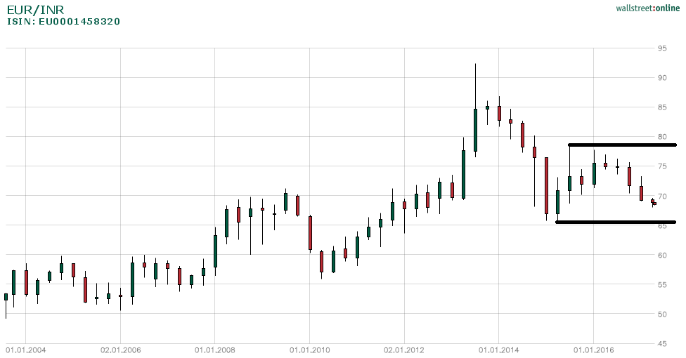 Selbst spekuliere ich seit Mitte des vierten Quartals 2016 auf ein erstarken der Indischen Rupie gegenüber dem Euro. Diese Wette ist innerhalb der Range recht Riskant und die Position dementsprechend klein gehalten. Erst bei einem Ausbruch auf der Unterseite im EUR/INR Währungspaar lohnt sich ein größerer Einstieg.