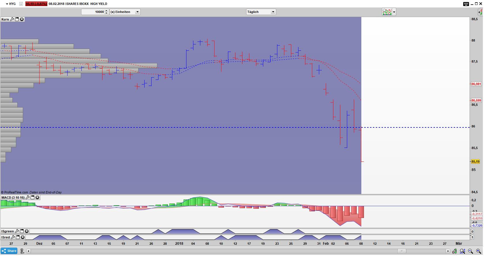 Schon öfters hatte ich die Bedeutung der High Yield Anleihen für den Aktienmarkt hervorgehoben. Das es hier beim High Yield ETF zur Zeit kein halten gibt, ist kein gutes Zeichen für die Aktienmärkte. Ein Grund warum es erst gestern erneut zu einem dramatischen Abfall zum Handelsschluss kam.