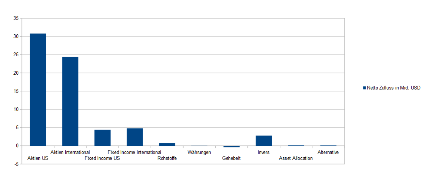 In alle US Aktien ETF´s flossen im vergangenen Monat 30,8 Milliarden USD. Die Internationalen Aktien ETF´s erhielten mit 24,3 Milliarden USD eine geringere Aufmerksamkeit. Die Fokussierung der Investoren liegt damit klar auf den US Märkten, was deren ausgesprochen starkem Momentum geschuldet sein wird.