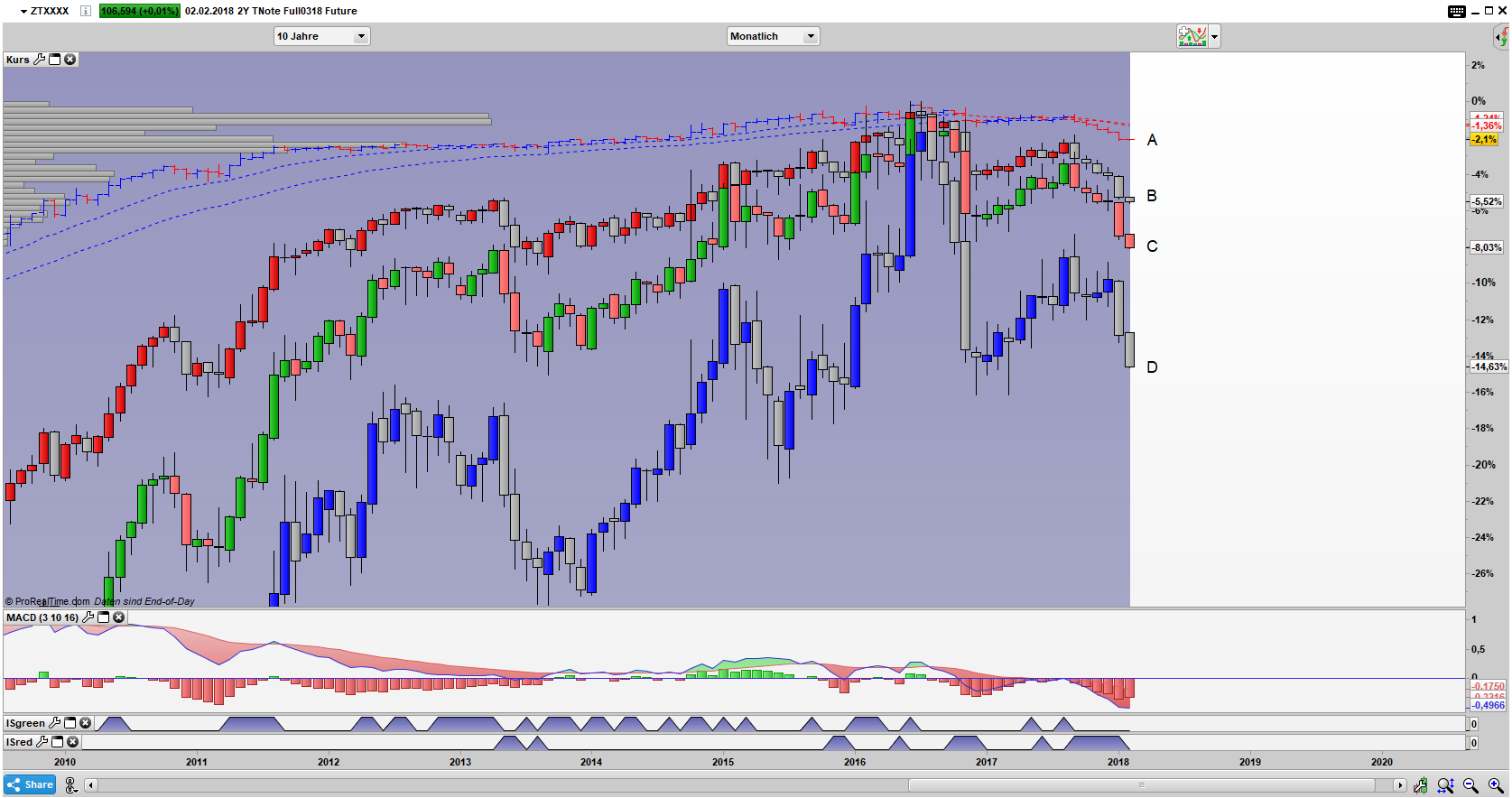 Die Kursverluste (ex Zinszahlungen) seit Mitte 2016 bei den US Anleihe Futures sind schon beachtlich. Die 2Y Treasury Notes verloren bisher 2,11% seit ihrem Hoch, während die 30Y T Bonds schon 14,63% verloren haben.