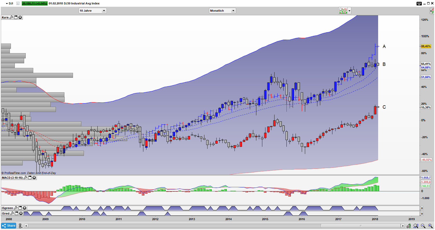 Sollte der Bereich B auf der Unterseite verlassen werden, dann droht ein Szenario wie Ende 2015 Anfang 2016. Ein solches abtauchen würde aber bei den US Indizes nur eine Korrektur im langfristigen Trend darstellen, ihn jedoch nicht gefährden.