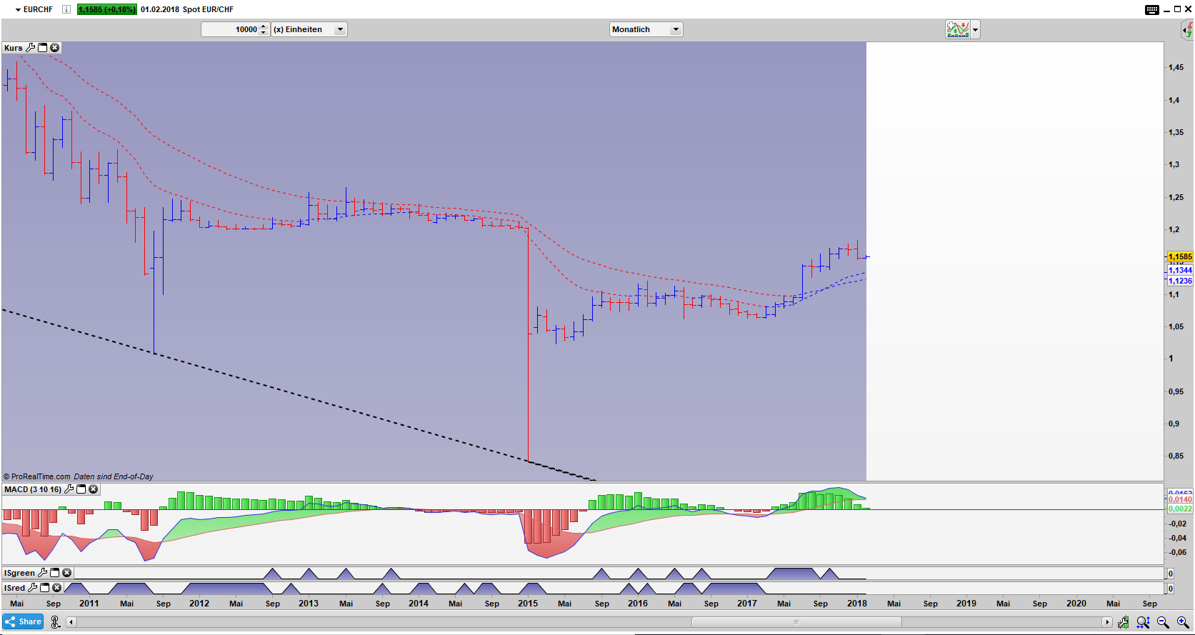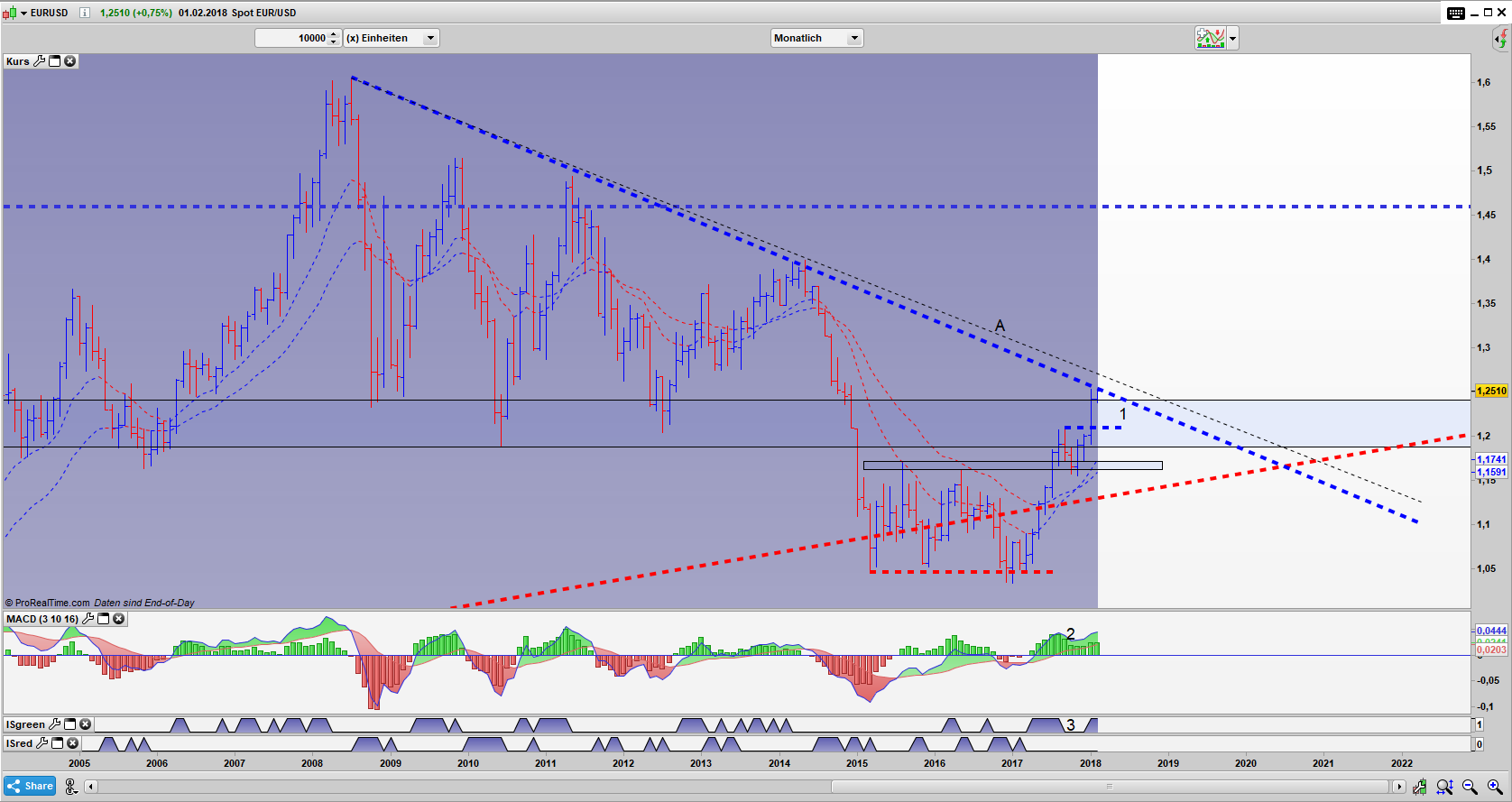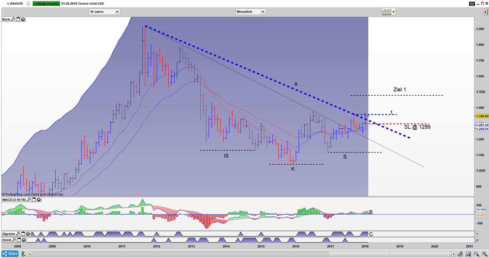 Aufgrund des relativ starken Monatsschluss nahe der Linie 1, stehen die Chancen gut dass der Ausbruch in angriff genommen wird. Sollte das geschehen, wird einer der Finanzmarkt Trends 2018 eine starke Rally im Gold sein.