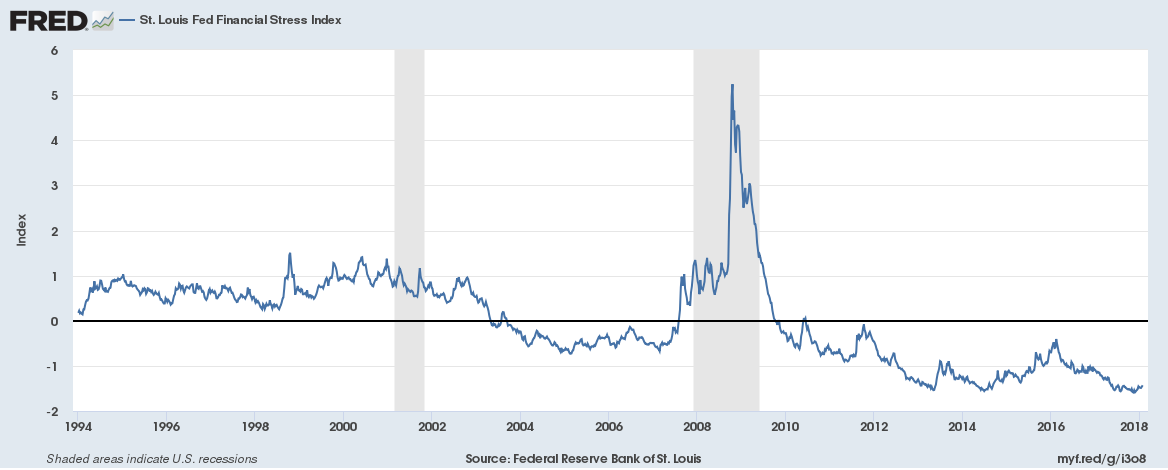 Insgesamt deutet noch nichts daraufhin, dass der langfristige Trend drehen könnte. Auch der St. Louis Fed Financial Stress Index weist auf eine recht entspannte Lage hin.