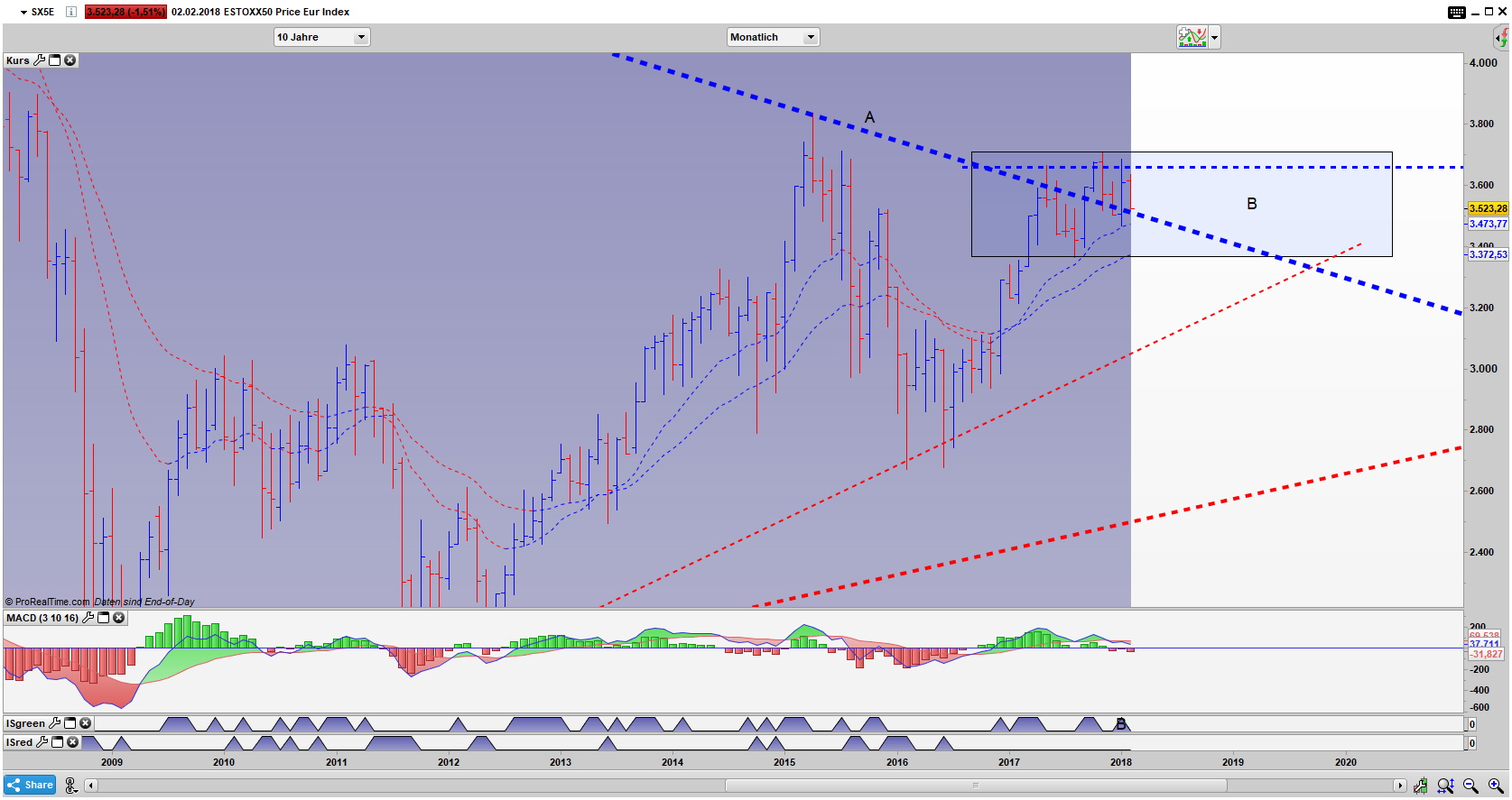 Die Europäischen Märkte sind im Gegensatz zu ihren Peers schwach. Der folgenden Graphik gezeigt Bereich B ist für die weitere Entwicklung entscheidend.