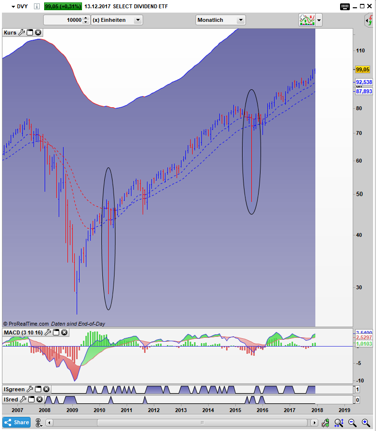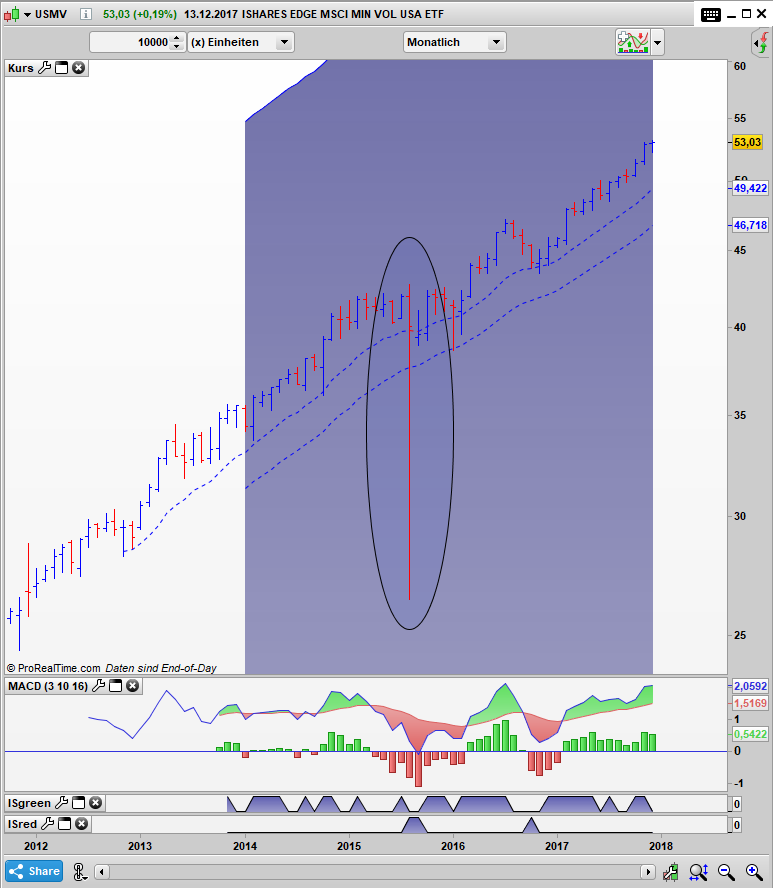 Solche Ausreißer sind gar nicht mal so selten. Insbesondere die Low Volatility und Dividenden ETF´s waren in der Vergangenheit von solchen Events betroffen. Der hier gezeigte iShares Edge MSCI Minimum Volatility USA ETF hatte an dem besagten Montag im August 2015 einen besonders krassen Abschlag zu verzeichnen. Ein weiterer ETF der dieses Verhalten gut aufzeigt ist der iShares Select Dividend ETF.