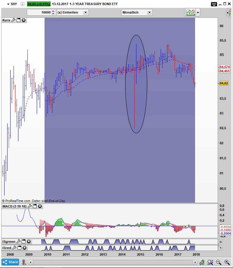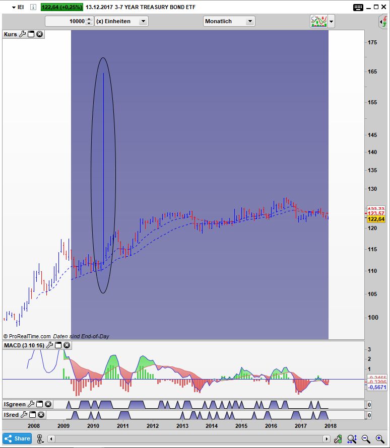 Doch auf die Low Volatility und Dividenden ETF´s ist ein solches Verhalten nicht Begrenzt. Einen der besten Charts gibt der iShares 3-7 Years Treasury Bond ETF, bei dem es zu einer krassen Reaktion beim Flashcrash 2010 kam.