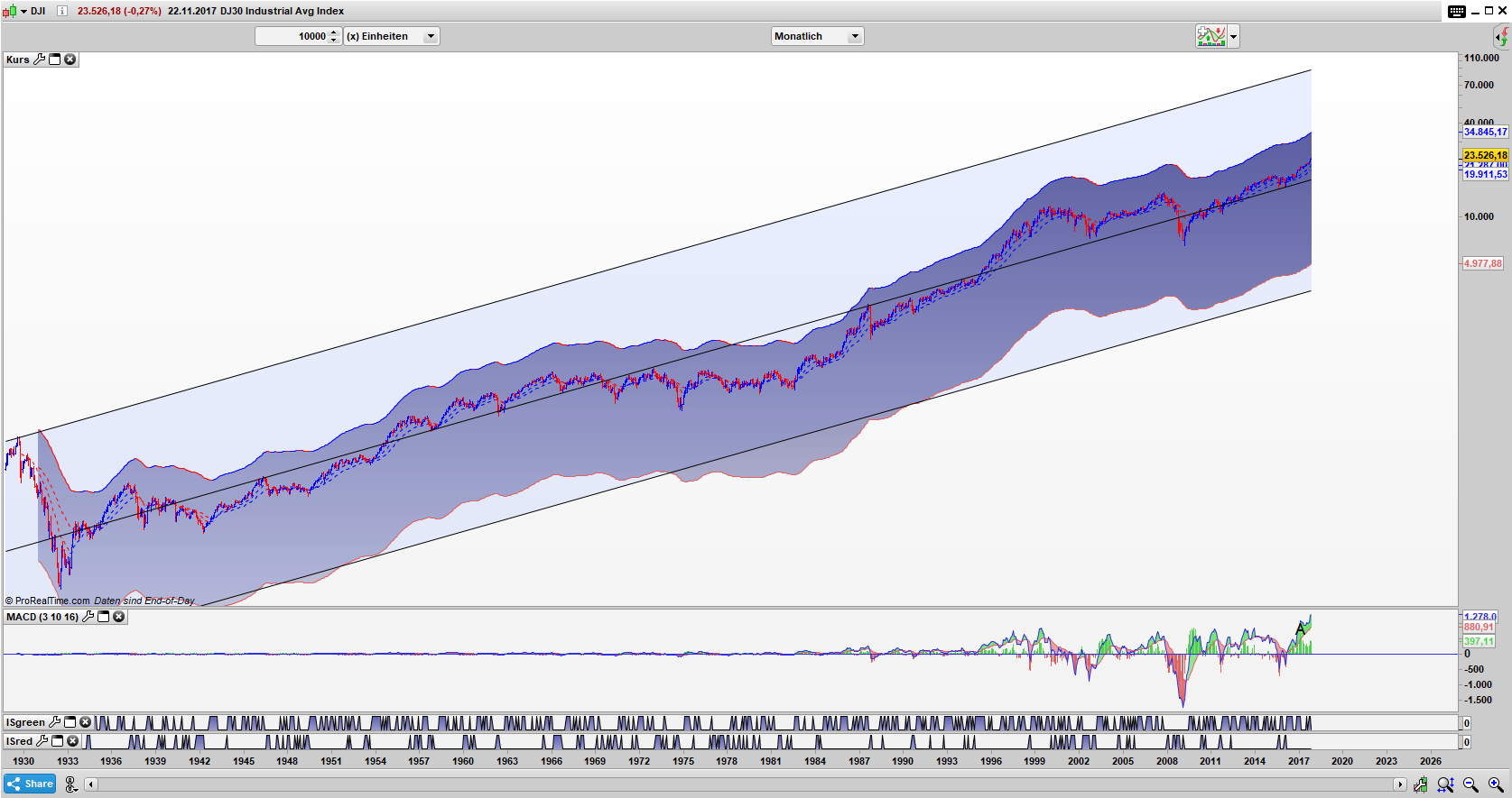 Der DJI startete das Jahr 1930 mit einem Wert von 248 Punkten. Einige Krisen, Kriege und Bullenmärkte später steht dieser Index mittlerweile bei 23526 Punkten. Dieser Wert entsprich ca. dem 94fachen des Index Wertes von 1930.
