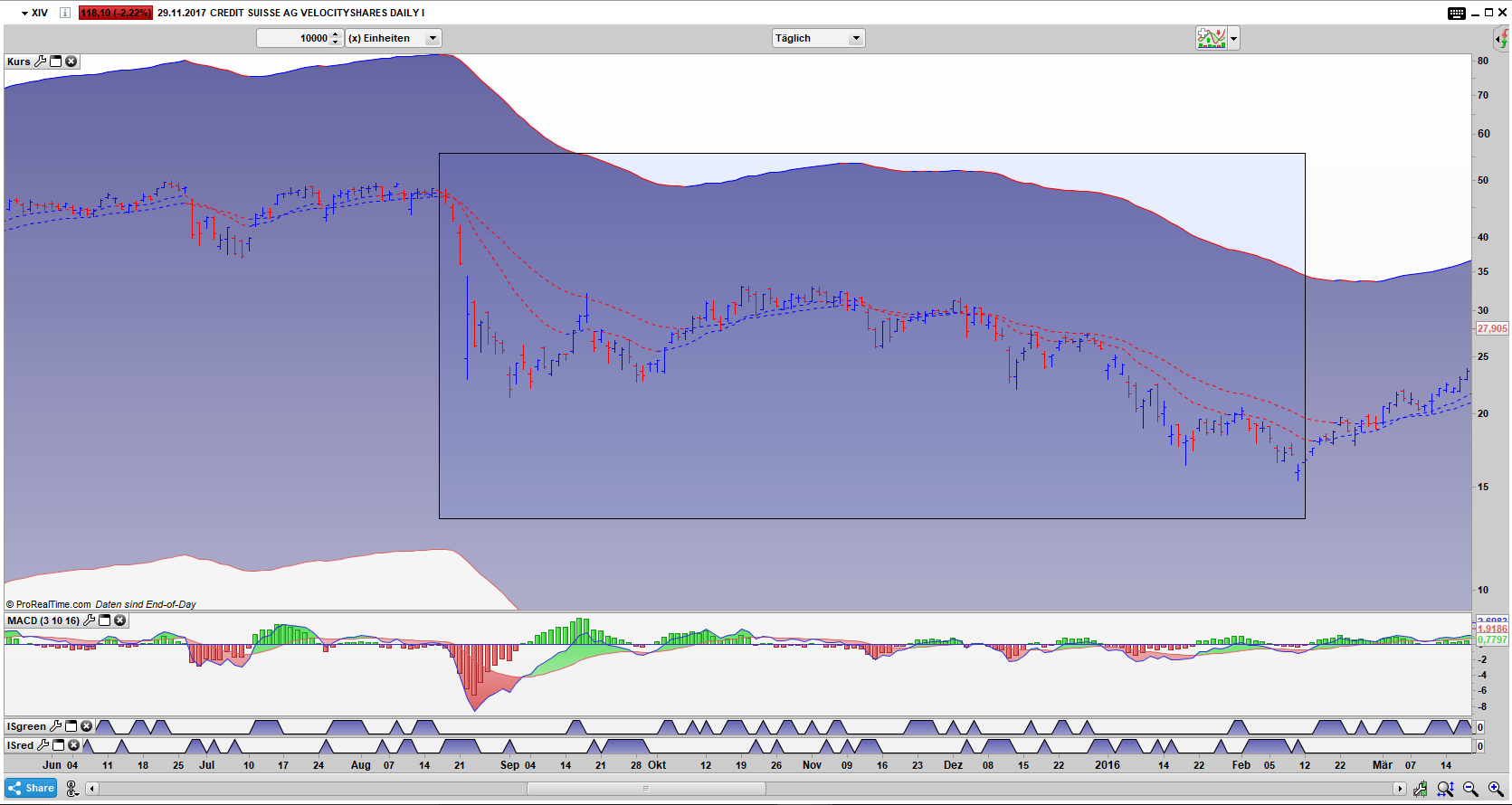 Insgesamt verlor der XIV im Zeitraum 19.08.2015 bis 11.02.2016 über 67% an Wert und erreichte sein Tief bei 15,36 USD je Share.