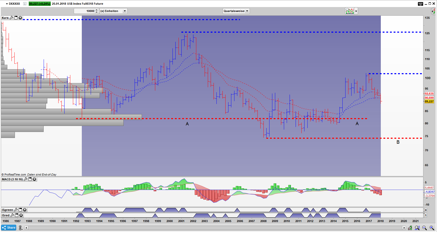 Das Bild im Dollar Index lässt auch für dieses Jahr nichts positives vermuten. Die Interessen die in den Währungen verfolgt werden, hatte ich gestern schon im Artikel Jahr des Euro beschrieben. Wenn der Dollar Verfall zunimmt und insbesondere auch das Erstarken des JPY gegenüber dem USD, muss mit einem Risk Off Event gerechnet werden.