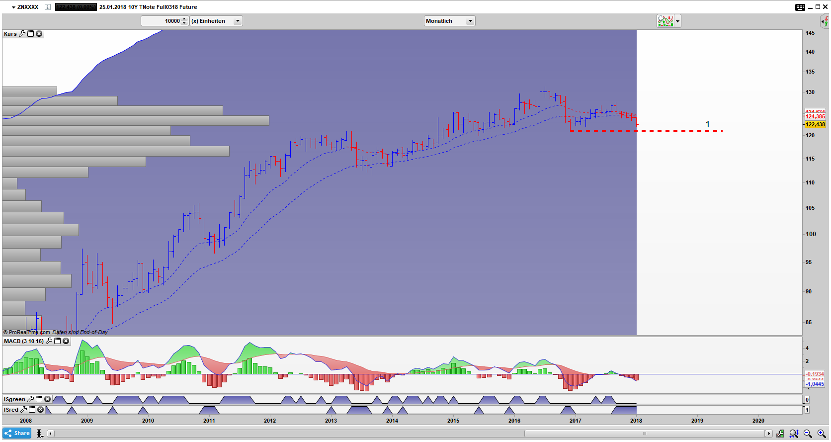 Die kurzlaufenden Anleihen befinden sich seit geraumer Zeit in einem Bärenmarkt. Allen voran die 2Y Treasury Notes. Doch entscheidender sind die 10 Jährigen Treasury Notes, denn sie gelten als Grad Messer für das allgemeine Zinsniveau in den USA.