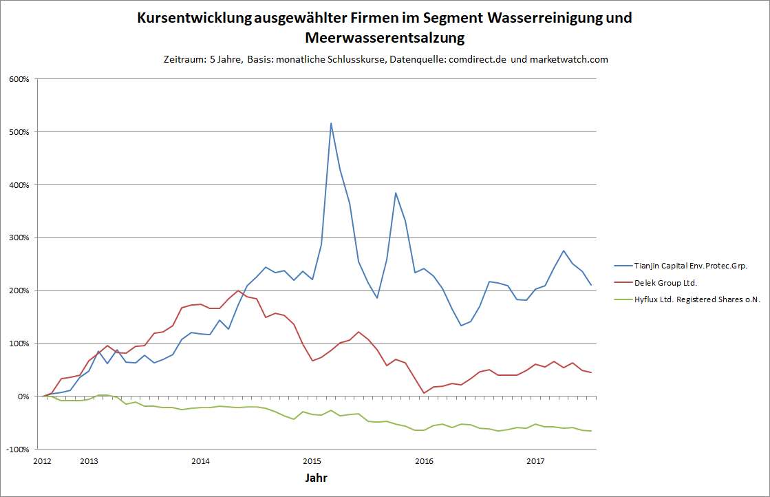 Entsprechend sind auch Unternehmen, die Entsalzungs- oder anderweitige Wasseraufbereitungsanlagen bauen und betreiben, aus Investorensicht keine Selbstläufer. Das weltweite Bedarfspotential an Trinkwasser garantiert auch in diesem Fall keine stetigen Kursanstiege oder Renditen. Ähnlich wie bei den spezialisierten Technik-Unternehmen neigen die Kurse relevanter Firmen zur Bildung von Peaks je nach Auftragslage und aktuellem Öffentlichen Interesse am Thema Wasser.