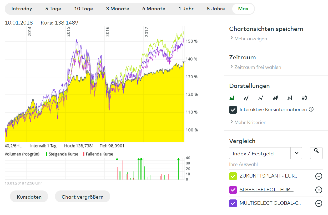 Laut Finanztreff weisen die weltweit ausgewogen investierenden Mischfonds im Zeitraum von 5 Jahren eine Performance von 23,32% auf. Das Ergebnis der Auswertung basiert auf den Daten von 156 Mischfonds. Im vergleich zu den durchschnittlichen 22,72% Rendite in den vergangenen 5 Jahren kann man sagen, dass das Musterdepot eine klare Outperformance aufzeigt.