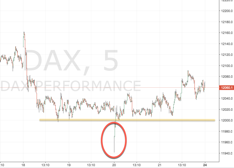 Als Erweiterungen gibt es neben der Strategie Fehlausbrüche durch Tageshochs und Tagestiefs noch die Fehlausbrüche aus einer Range und die Fehlausbrüche durch lokale Hoch- und Tiefpunkte. So gesehen erst vergangen Woche im DAX, den hier hier einmal kurz darstelle: