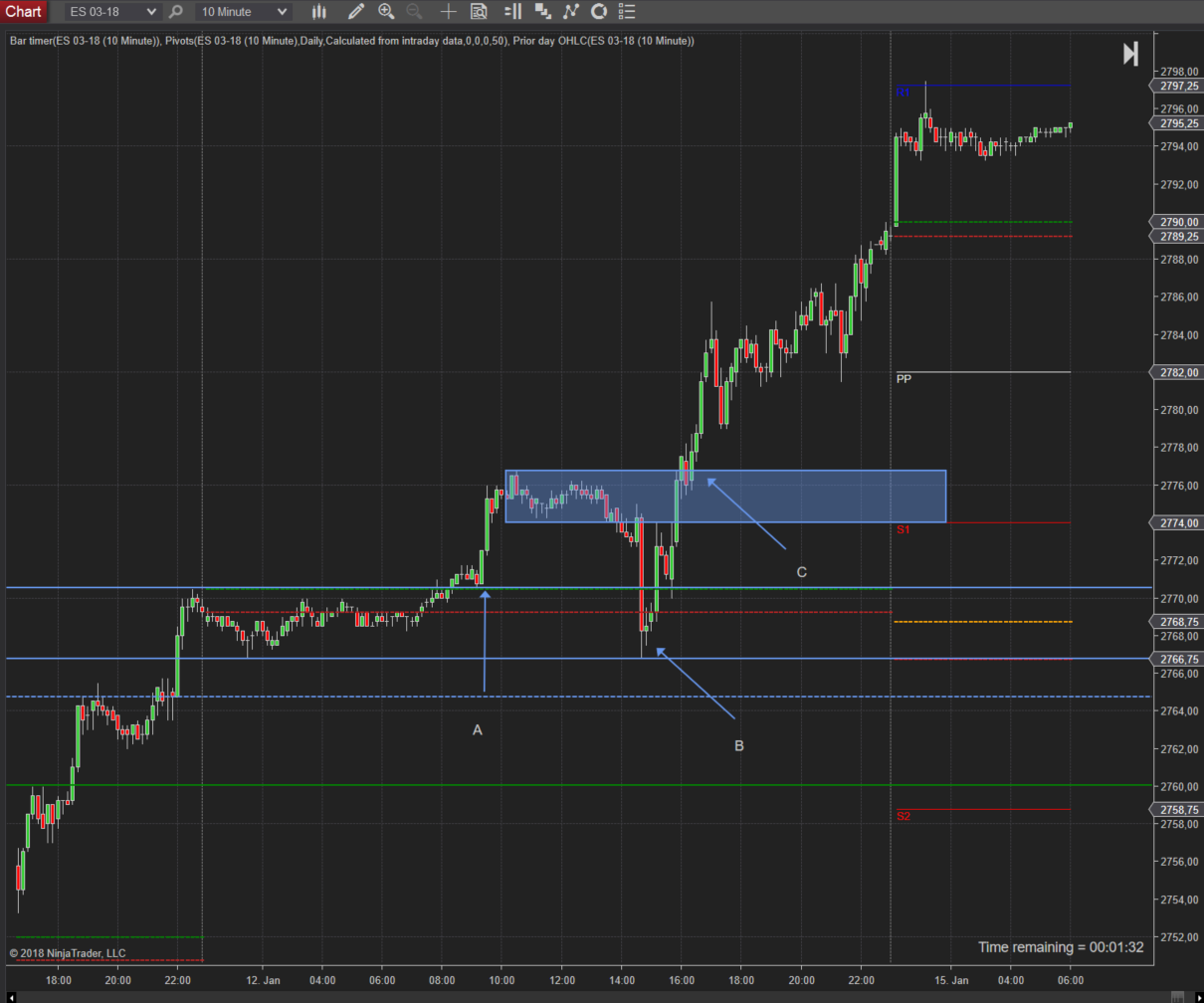 Bereich A (Pfeil nach oben) ist für mich eine mögliche Wendezone. Der Pfeil ist etwas länger da ich damals die gestrichelte Linie, welche ein Gap der „Haupthandelszeit“ darstellt, mit einbezogen habe. Für den Trend sind aber die beiden darüber liegenden Linien maßgeblich.