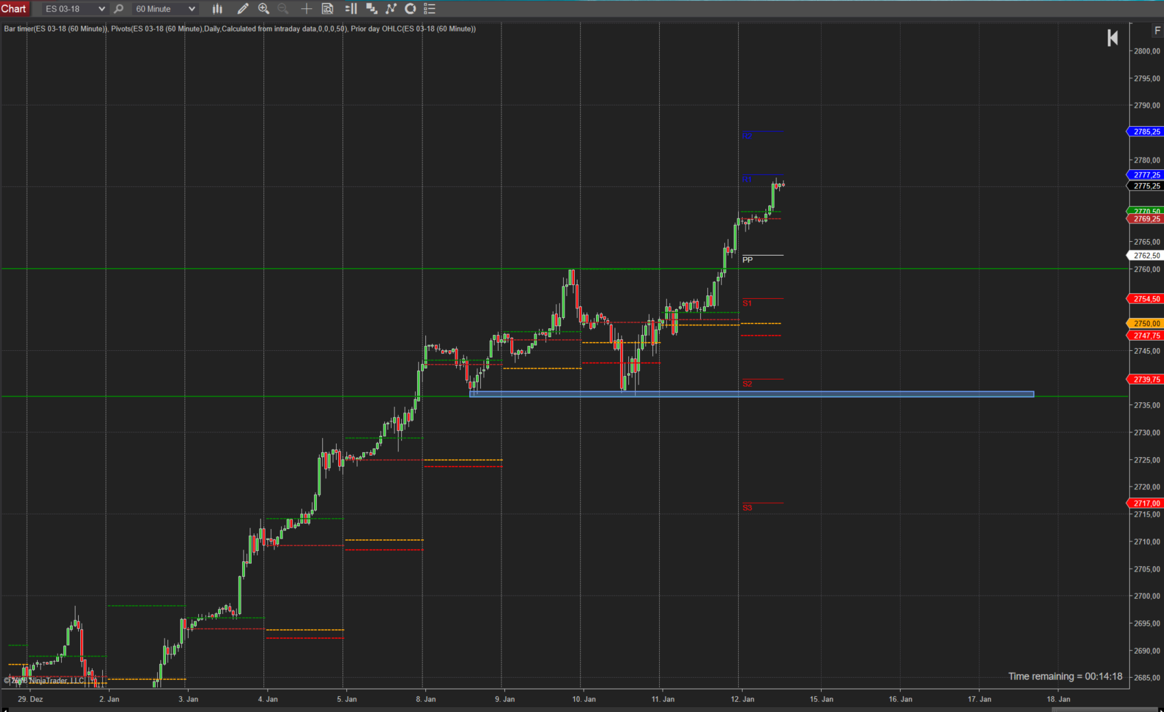 Auch hier ist ein einwandfreier Aufwärtstrend gegeben und fast wie eine Treppe im Chart. Aktuell befindet sich die letze Bewegung von heute früh in der Korrektur und das ist erstmal bis an die 2766,75 in Ordnung. Da ich Bereiche ganz interessant finde ist eine weitere Linie bei 2770,50 dazwischen kann der Kurs bei einer geringen Korrektur, aus Stundensicht, bereits wieder nach oben drehen.
