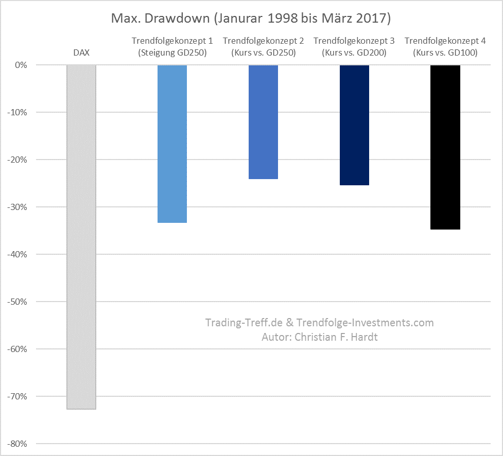 Um diesen Effekt optisch noch etwas greifbarer zu machen, zeige ich in der folgenden Grafik den jeweils höchsten aufgetretenen Verlust (max. Drawdown) der verschiedenen Strategien. Es ist gut zusehen, dass die vier Strategien relativ ähnlich abschneiden. Alle Strategien hätten des DAX hinsichtlich dieser Risikokennziffer deutlich hinter sich gelassen (obwohl es sich um recht einfache Strategien handelt).